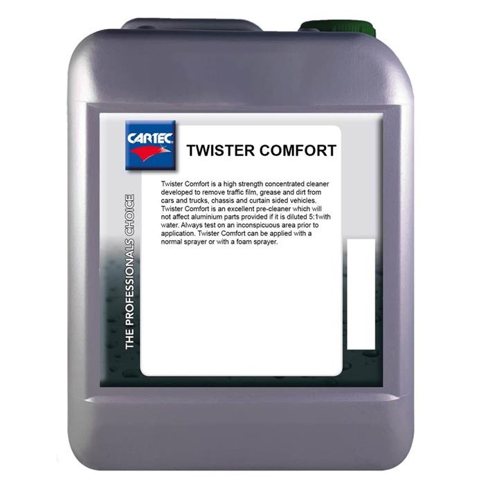 Pinttyneeseen likaan kehitetty esipesuaine. Aine on valmistettu tehokkaaseen liikenne filmin-, rasvan- ja pinttyneen lian poistamiseen. Tehokas esim. alustan- rungon- ym. pesuun. Ei vahingoita alumiini ym. osia 1:5 laimennettuna vedellä. alustan ja verho puolinen ajoneuvoja. Kokeile tuotetta aina ensin pienelle huomaamattomalle aluelle ennen käyttöä. Twister Comfort:a voi levittää painepullolla, pesuaine levittimellä tai vaahdottajalla.