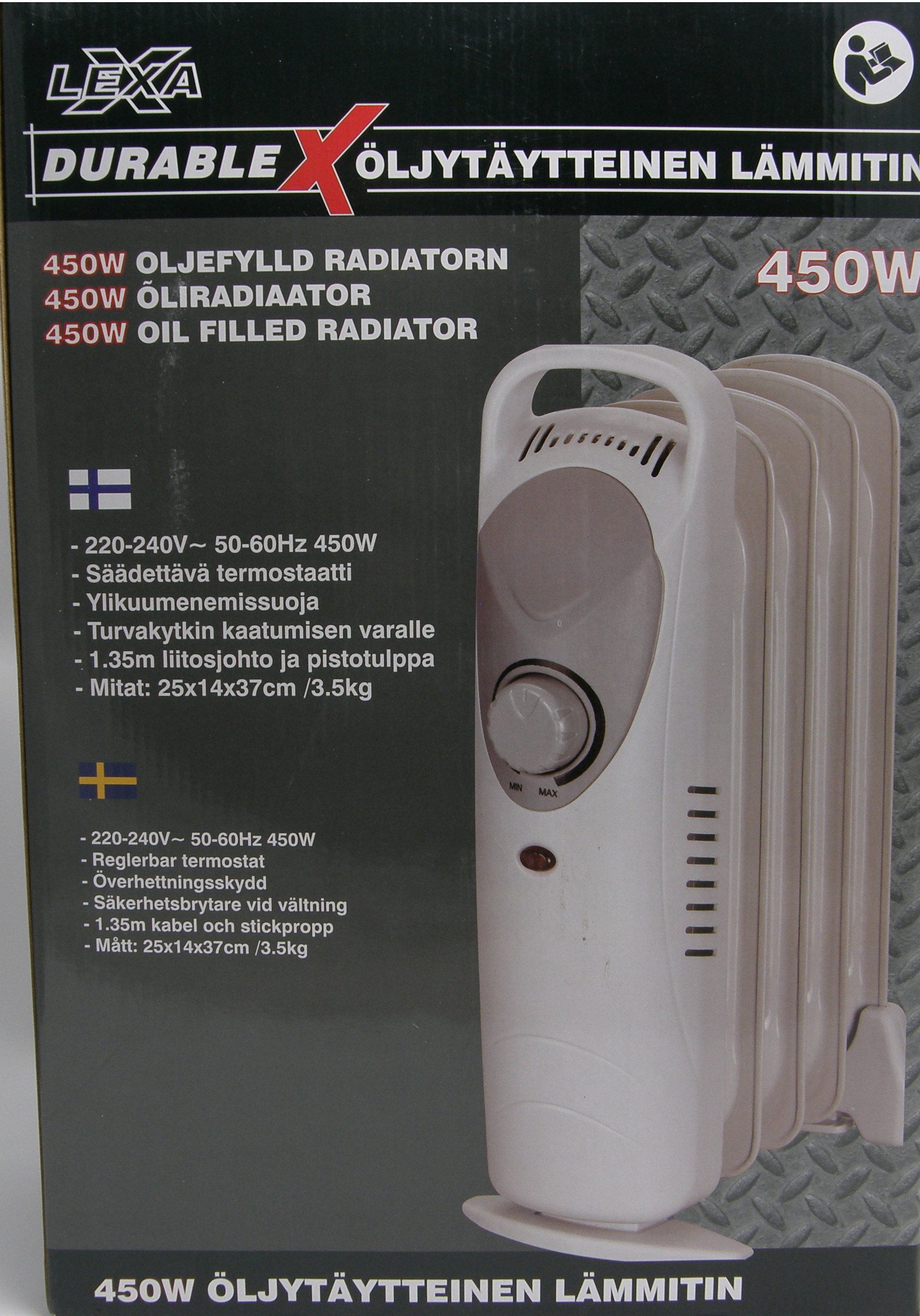 Öljytäytteinen patteri 450W Termostaatti Ylikuumenissuoja Turvakytkin kaatumisen varalle 1,35 liitosjohto pistotulpalla mitat 25x14x37 cm paino 3,5 kg
