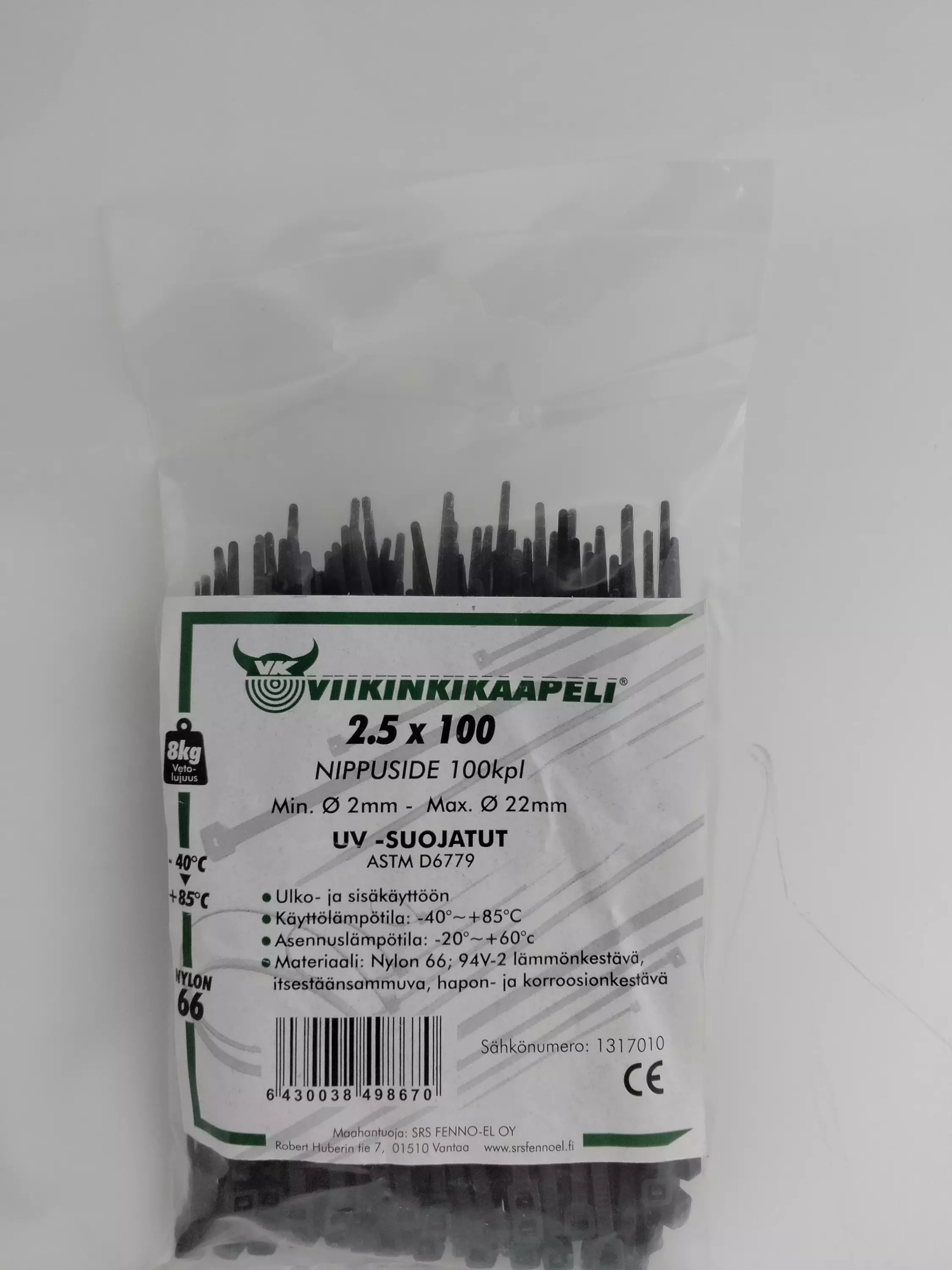 Nippuside 2,5x100 Musta 100kpl/pussi Min. Ø 2mm - Max. Ø 22mm UV-Suojatut Ulko- ja sisäkäyttöön Käyttölämpötila: -40°C ~ +85°C Asennuslämpötila: -20°C ~ +60°C Materiaali: Nylon 66;... Lue lisää