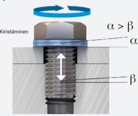 suurempi kuin kierteennousu ‘ß’, muodostuu kiilaava vaikutus, joka estää ruuvia kiertymästä auki jopa kaikkein
